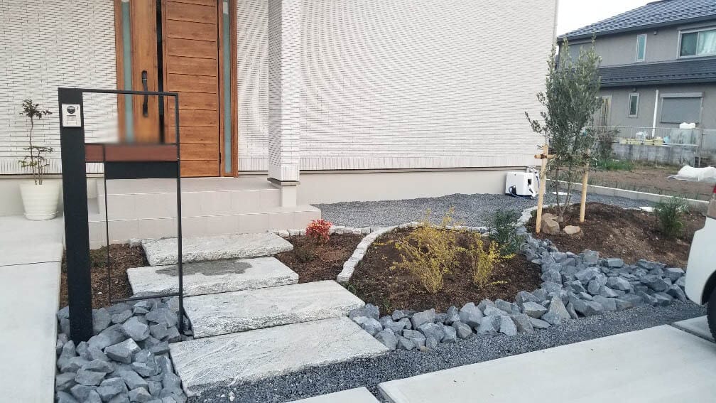 数種類の自然石をふんだんに使用したアプローチ兼お庭 H邸様 2022年3月15日 2022年4月16日 工事ブログ 数種類の自然石をふんだんに使用してアプローチ兼お庭を作りました。秋が来る頃には植物も元気よく育っておしゃれなお庭になっているでしょう♪